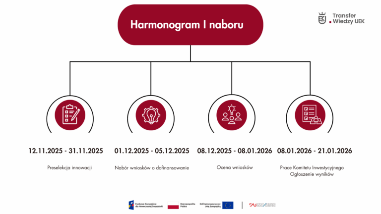 Strona główna Dział Transferu wiedzy UEK Transfer wiedzy na UEK łączy naukę z biznesem, wspierając innowacje i rozwój gospodarczy.Społeczność akademicka dzieli się wiedzą i doświadczeniem, wspomagając rozwój lokalnych i globalnych inicjatyw. arrow-top-right Oferta współpracy!Jesteś zainteresowany współpracą? Kliknij tutaj! Współpraca Przejdź Dla naukowca Przejdź AKADEMICKI INKUBATOR PRZEDSIĘBIORCZOŚCI UEK Przejdź Inkubator rozwoju Przejdź Aktualności Wszystkie aktualności Aktualności Spotkanie Konsorcjum Science4Business Kraków 11 grudnia, 2025 Czytaj Aktualności Harmonogram I naboru w ramach projektu „Science4Business – Nauka dla Biznesu” 3 grudnia, 2025 Czytaj Aktualności Ogłoszenie naboru wniosków na finansowanie prac przedwdrożeniowych w projekcie „Science4Business – Nauka dla Biznesu” 17 listopada, 2025 Czytaj Dział Transferu Wiedzy UEK Zobacz