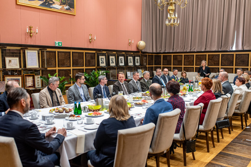 4 marca 2026 r., w Sali Profesorskiej UEK odbyło się śniadanie biznesowe, współorganizowane przez Dział Transferu Wiedzy UEK w ramach działań projektu „Science4Business – Nauka dla Biznesu”, z udziałem przedstawicieli przedstawicieli sektora bankowego.